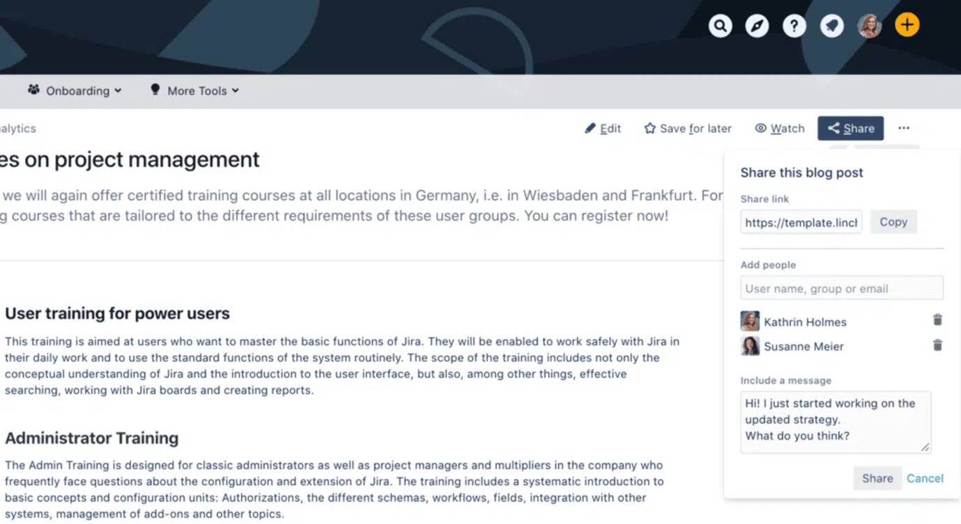Um gemeinsam Großes zu schaffen, können Sie mit Ihren KollegInnen effektiv und transparent an Inhalten arbeiten und Intranet-Seiten schnell und einfach mit anderen teilen. Ob kurzes Feedback oder ein ausführlicher Kommentar – alle Diskussionen dazu finden direkt im Kontext statt.