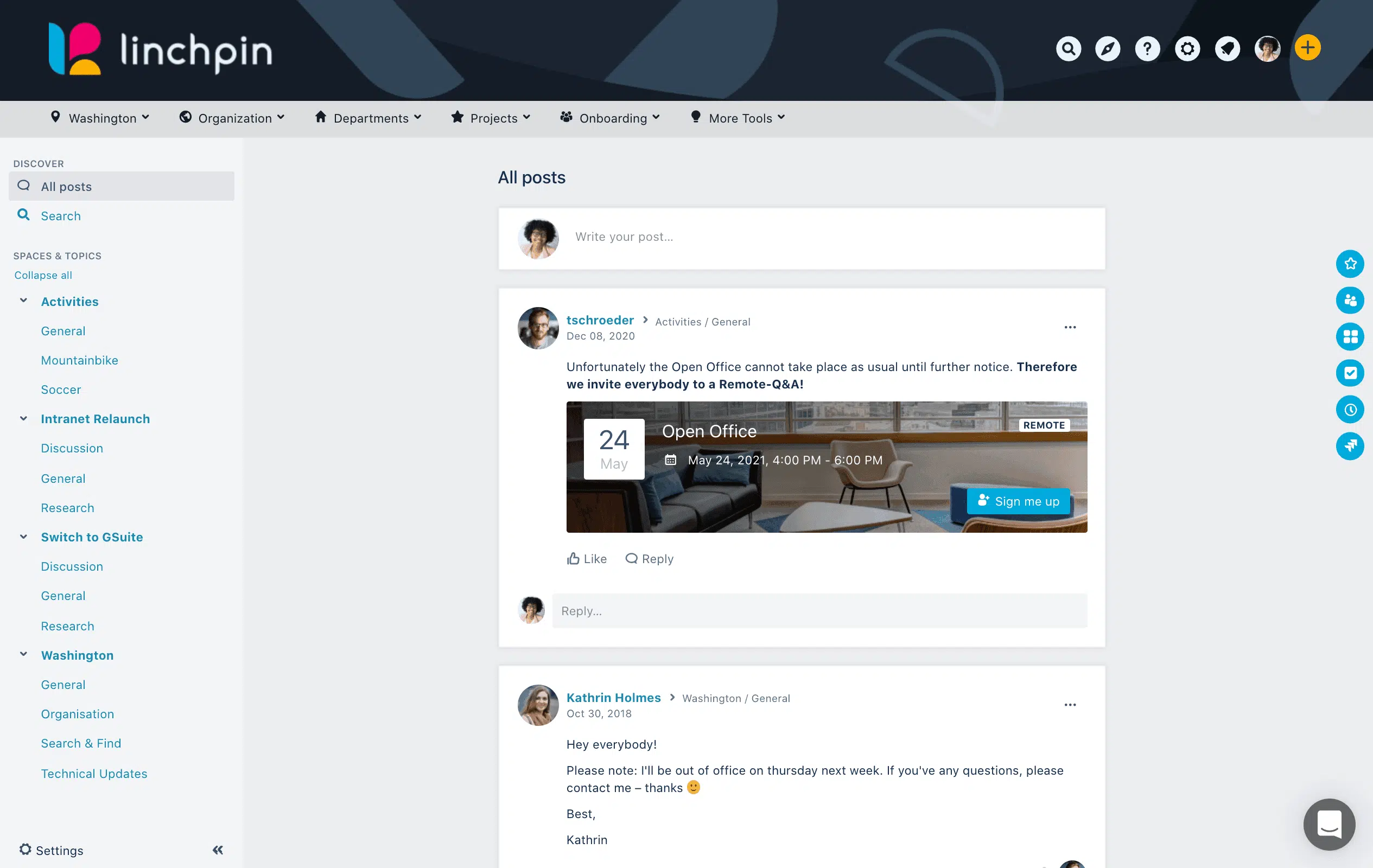 Linchpin steht nicht nur für nachhaltiges Wissensmanagement, sondern auch für transparente, schnelle Kommunikation und Zusammenarbeit. Moderne Community-Funktionen ermöglichen es Ihnen, Ideen, Fragen und aktuelle Topics auszutauschen - ohne Einstiegshürden, denn die Social-Media-Funktionen sind Ihnen aus den bekannten Internet-Netzwerken vertraut.