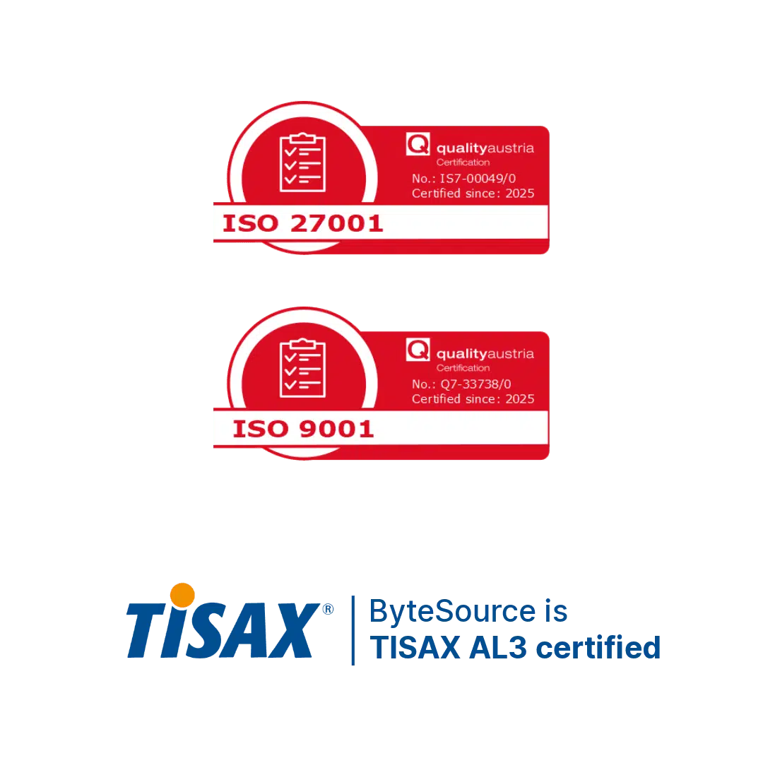 Mit ISO 9001:2015-, ISO/IEC 27001:2022-Zertifizierung und TISAX AL3-Assessment ist ByteSource der verlässliche Partner für Qualität, Informationssicherheit und Compliance in hochregulierten Branchen.