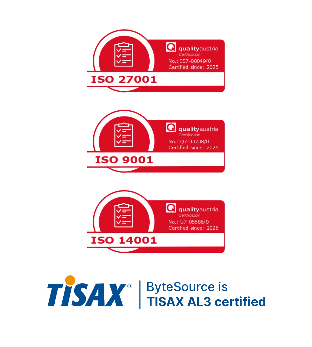 Mit Zertifizierungen nach ISO 9001:2015, ISO/IEC 27001:2022 und ISO 14001:2015 sowie einem TISAX AL3-Assessment ist ByteSource ein verlässlicher Partner für Qualität, Informationssicherheit, Compliance und Nachhaltigkeit in hochregulierten Branchen.