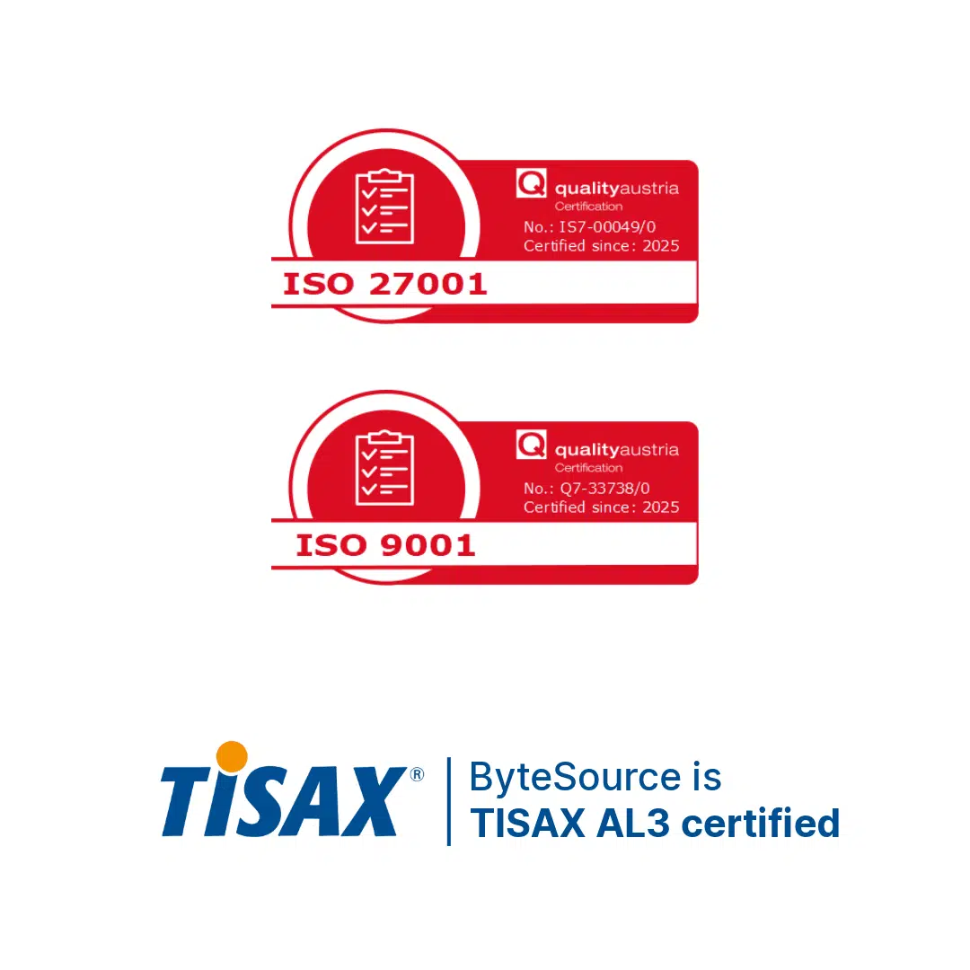 With ISO 9001:2015, ISO/IEC 27001:2022, and TISAX AL3 certifications, ByteSource is the trusted partner for quality, information security, and compliance in highly regulated industries.